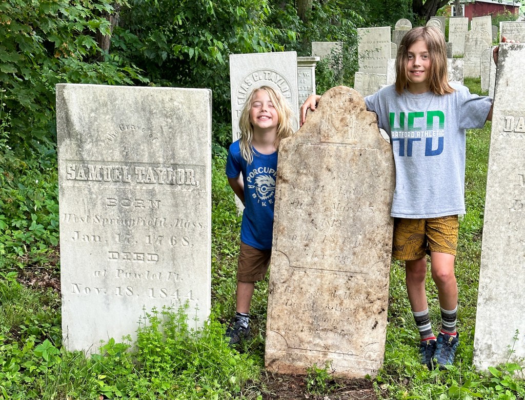 The boys visiting the grave site of their fourth great grand parents, Samuel and Olive Pomroy Taylor, in Pawlet, Vermont in 2023. Samuel and Olive’s father, Lt. John Pomroy, moved to Pawlet in the late 1700s.